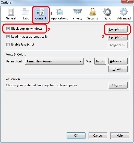 Kies Content (1). Controleer de instelling voor Block pop-up windows (2). Bij het uitzetten van deze instelling kun je het blokkeren van pop-up windows aan en uitzetten. Om deze instelling iets gedetailleerder in te stellen moet hij aan staan en druk op de knop Exceptions (3).
